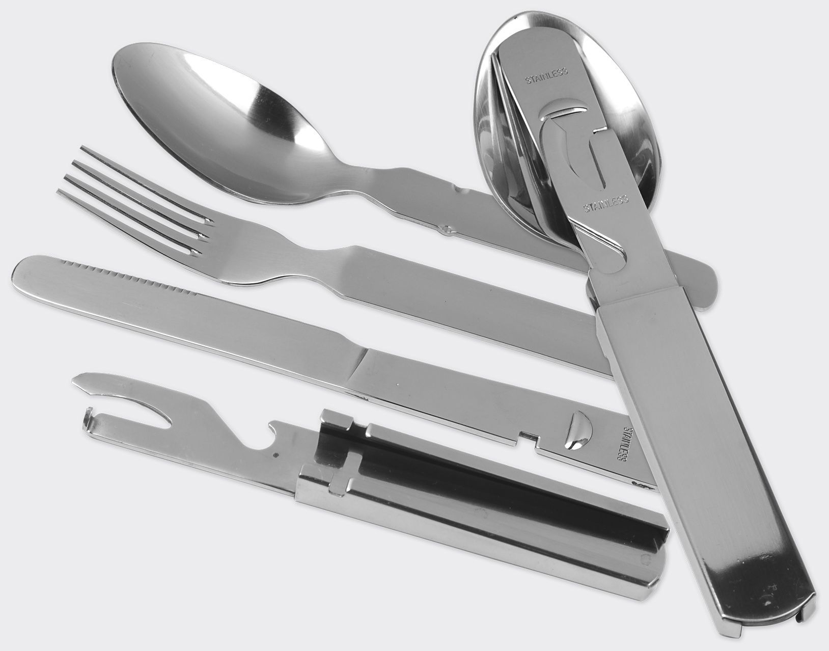 W skład niezbędnika wchodzi: nóż, widelec, łyżka, otwieracz do konserw oraz butelek.