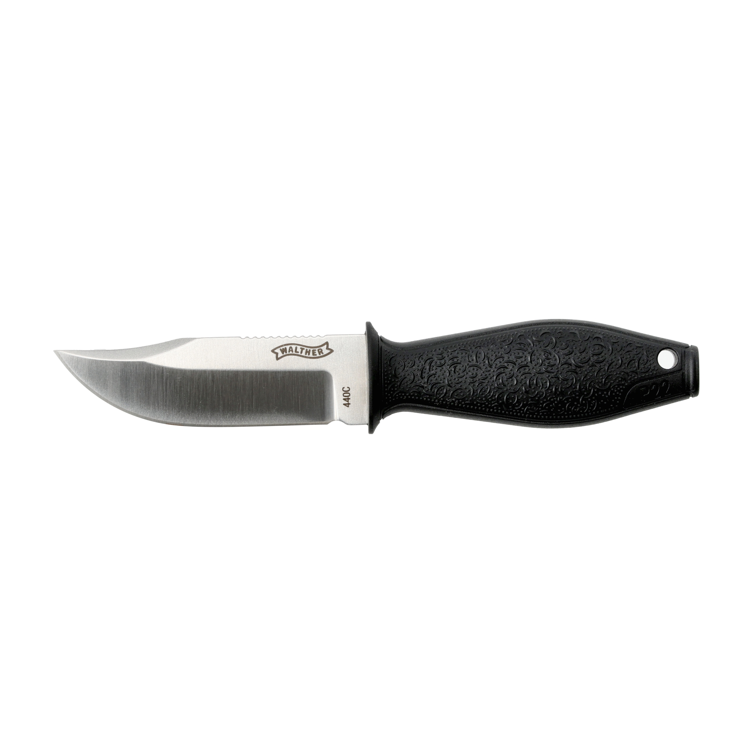 Rękojeść noża została zaprojektowana z myślą o pewnym i komfortowym chwytaniu. Wykonana z twardego polimeru, została dodatkowo pokryta gumową powłoką, która zapewnia antypoślizgową fakturę, identyczną z tą, która znajduje się na tylnej nakładce chwytu w pistolecie Walther P22. Dzięki nieregularnemu, drobnemu teksturowaniu, rękojeść oferuje doskonałą przyczepność, co jest szczególnie ważne w trudnych warunkach (np. wilgotność, pot, czy zimno).
