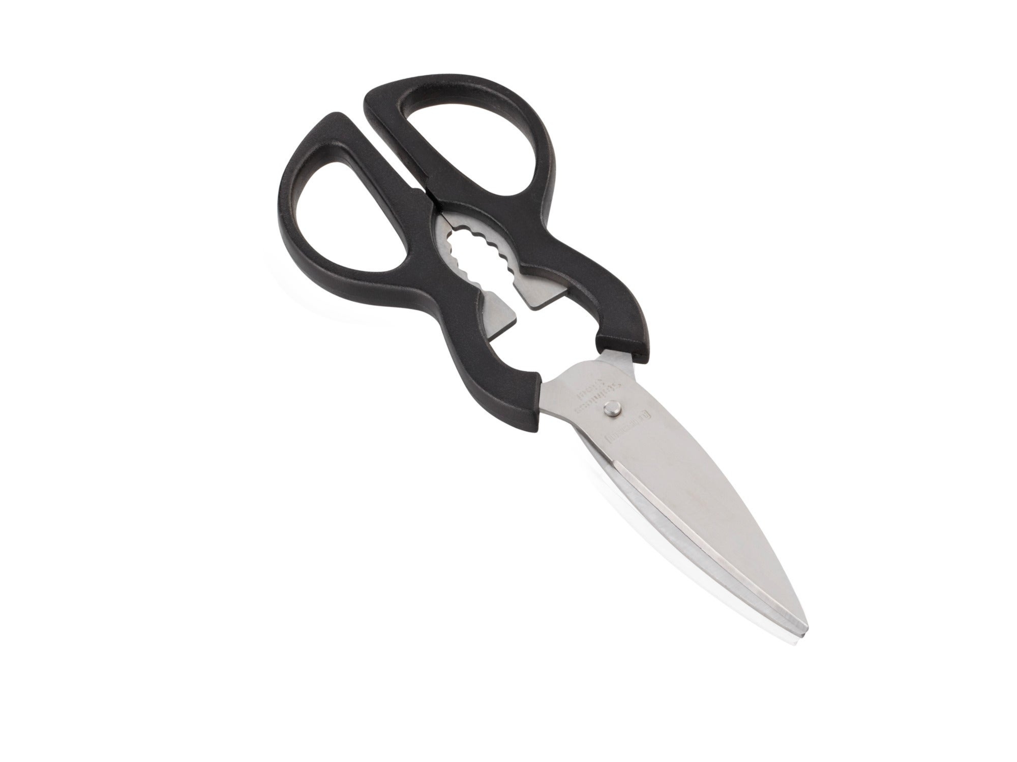 Nożyczki domowe marki Leifheit to praktyczny pomocnik, który skutecznie ułatwi wykonywanie codziennych prac i zawsze będzie pod ręką. Ostrza nożyczek zostały wykonane z bardzo wytrzymałej i nierdzewnej stali szlachetnej. Nie stępią się nawet po wieloletnim użytkowaniu. Uchwyty nożyczek, które dobrze leżą w dłoni, pokryto wysokiej jakości tworzywem sztucznym w kolorze czarnym. Model ten jest wielofunkcyjny – posiada także wbudowany otwieracz do zakrętek i do usuwania kapsli oraz dziadek do orzechów.