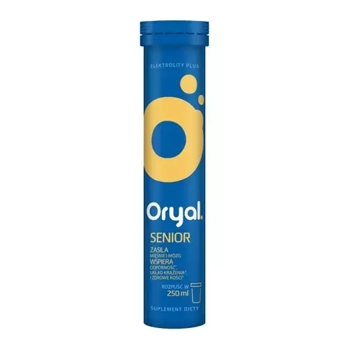 Suplement diety Oryal Senior ma postać tabletek musujących o smaku pomarańczy i bergamoty. Preparat jest rekomendowany do stosowania u osób starszych m.in. jako środek pomagający utrzymać prawidłowe nawodnienie organizmu i uzupełniający elektrolity.