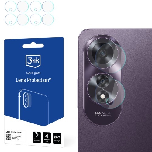 Szkło hybrydowe 3mk Hybrid Glass Lens Protection Oppo A60 4G Nietłukące się szkło hybrydowe Oryginalne hybrydowe szkło ochronne marki 3MK z serii Hybrid Glass Lens Protection. Unikalne połączenie cech szkła i folii. Stanowi doskonałą ochronę soczewki aparatu, którą wzmacnia o całe 200%. *Przedmiotem sprzedaży jest sam zestaw szkieł na obiektyw smartfona z zestawem aplikacyjnym, pozostałe akcesoria widoczne na zdjęciach służą jedynie przedstawieniu funkcjonalności produktu. Wysoka ochrona Elastyczne, odporne na pękanie, o twardości 7H. Wzbogacone powłoką ceramiczną, wzmacnia aparat o 200%, pochłaniając energię uderzenia. Przy upadku szkło nie rozpada się na wiele ostrych kawałków. Cienkie- tylko 0,16 mm grubości Niezwykle cienkie (0,16 mm) zachowuje realne odczucie szkła, zapewniając doskonałą klarowność. Precyzyjne dopasowanie Szkło zapewnia doskonałe pokrycie soczewek aparatu dzięki zaokrąglonym krawędziom. Precyzyjnie wycięte i idealnie dopasowane do całej powierzchni. Łatwa aplikacja Szkło jest niezwykle łatwe w montażu, nie pozostawia bąbelków. Montaż W kilka minut przekonasz się, jak łatwo można zamontować szkło bez bąbelków powietrza. W opakowaniu: 4 zestawy szkła Hybrid Glass Lens Protection 1 sucha ściereczka Mokre ściereczki