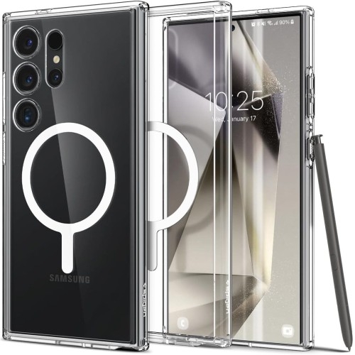 ℹ️ Produkt pochodzi z outletu!Na aukcji kupujesz produkt, który nie kwalifikuje się do sprzedaży jako pełnowartościowy z powodu uszkodzonego lub rozpakowanego opakowania, dlatego oferujemy go w obniżonej cenie!Każdy produkt jest sprawdzony i w pełni sprawny, posiada pełną gwarancję producenta oraz wsparcie techniczne sklepu.Etui Spigen Ultra Hybrid OneTap Metal Ring MagFit Samsung Galaxy S24 Ultra Hybrydowa konstrukcja z magnesem Hybrydowe etui od marki Spigen z serii Ultra Hybrid OneTap MagFit to pokrowiec, który dzięki wbudowanemu pierścieniowi magnetycznemu jest kompatybilny z akcesoriami posiadającymi mocowanie typu MagSafe. Cover wykonany został z połączenia termoplastycznej poliuretanowej ramki oraz wytrzymałej poliwęglanowej tylnej osłony. Jednoczęściowa konstrukcja typu "plecki" zapewnia doskonałą ochronę w codziennym użytkowaniu. Ergonomiczna budowa sprawia, że całość świetnie leży w dłoni oferując wygodny i pewny chwyt. Smukły design z przezroczystym tyłem prezentuje oryginalny wygląd Twojego urządzenia. *Przedmiotem sprzedaży jest samo etui, pozostałe akcesoria widoczne na zdjęciach służą jedynie przedstawieniu jego funkcjonalności. Kolor producenta: White (kolor etui: przezroczysty / kolor pierścienia: biały) Etui kompatybilne ze szkłami o wymiarach mniejszych niż (długość x szerokość): 15,93 x 7,56 cm Lekka i smukła ochrona To wyjątkowo lekkie i smukłe etui, które nie pogrubia znacznie urządzenia, zapewniając mu codzienną ochronę przed zarysowaniami. Skutecznie chroni tył i boki smartfona, a lekko wystające ranty chronią sekcję aparatów i ekran przed zarysowaniami na płaskich powierzchniach. Dzięki temu Twój wyświetlacz będzie całkowicie bezpieczny podczas odkładania telefonu ekranem w dół, zatem korzystaj swobodnie z gestów wyciszania, oraz nie martw się o swoje obiektywy odkładając telefon na blat biurka. Transparentny design Stylowy design charakteryzuje się przezroczystym panelem na pleckach o długotrwałej przejrzystości, dzięki czemu Twoje urządzenie zyskuje na dodatkowej ochronie, a jednocześnie pozostawia na widoku wiele ze swojego oryginalnego wyglądu. Dodatkowym atutem przezroczystego tyłu jest możliwość dowolnej personalizacji tej części obudowy, wystarczy wsunąć pod nią ulubione zdjęcia, stickery, itp. by urozmaicić wygląd urządzenia na swój własny i oryginalny sposób. Kompatybilne z systemem mocowania MagSafe Wewnątrz etui znajduje się wbudowany pierścień magnetyczny zapewniający kompatybilność z akcesoriami posiadającymi mocowanie typu MagSafe. Dzięki niemu nadal możesz korzystać z posiadanej ich gamy bez potrzeby zdejmowania pokrowca. Osłony na przyciski Precyzyjne wycięcia zapewniają swobodny dostęp do wszystkich interfejsów smartfona, dzięki czemu całość jest niezwykle funkcjonalna i wygodna w użytkowaniu. Cover posiada także zintegrowane osłony na przyciski, które są responsywne i zachowują dobrze wyczuwalne kliknięcie. Wzmocnione narożniki Etui zapewnia solidną ochronę przy minimalnych gabarytach oraz wadze podczas upadków. Dzięki technologii Air Cushion®, czyli poduszek powietrznych umiejscowionych w narożnikach, skutecznie amortyzuje wstrząsy od upadków, spełniając wymogi standardu odporności Mil-Grade. Dobrze trzyma się w dłoni Dzięki ramce z TPU futerał wygodnie i pewnie leży w dłoni, a do tego łatwo się zakłada jak i zdejmuje. Zastosowany materiał nie zakłóca ładowania bezprzewodowego - dotyczy modeli telefonów wyposażonych w tą technologię.