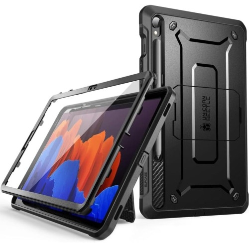 ℹ️ Produkt pochodzi z outletu!Na aukcji kupujesz produkt, który nie kwalifikuje się do sprzedaży jako pełnowartościowy z powodu zarysowania lub zabrudzenia którego nie da się usunąć, dlatego oferujemy go w obniżonej cenie!Każdy produkt jest sprawdzony i w pełni sprawny, posiada pełną gwarancję producenta oraz wsparcie techniczne sklepu. Wspomniane wady nie wpływają na użytkowanie przedmiotu.Etui Supcase Unicorn Beetle Pro with SP Samsung Galaxy Tab S9 (SM-X716B, SM-X710) Etui z osłoną ekranu Oryginalne etui od marki Supcase z serii Unicorn Beetle Pro wykonane z połączenia amortyzującego termopoliuretanu oraz mocnego poliwęglanu. Obudowa posiada zintegrowaną rozkładaną podpórkę KickStand i wbudowaną osłonę ekranu we frontowej ramce, która dopełnia ochronę urządzenia. Taka hybrydowa kombinacja z funkcjonalnymi dodatkami zabezpiecza kompleksowo urządzenie z każdej strony i oferuje wyjątkowo dużą wytrzymałość od wstrząsów i ogromną wygodę w codziennym użytkowaniu. Dzięki specjalnie zaprojektowanemu wycięciu na pleckach pokrowca możesz przechowywać w nim także rysik S-Pen z zachowaniem jego pełnej funkcjonalności. *Przedmiotem sprzedaży jest samo etui, pozostałe akcesoria widoczne na zdjęciach służą jedynie przedstawieniu jego funkcjonalności. Wersja etui z wbudowaną osłoną wyświetlacza. UWAGA: To etui nakładamy bezpośrednio na samo urządzenie, które nie może mieć naklejonych żadnych dodatkowych folii ani szkła. Kolor producenta: Black Z czego składa się UB Pro Budowa etui składa się z dwóch części: tylnych plecków i przedniej ramki, między które wkładamy urządzenie i składamy konstrukcję w jedną całość. Pancerna i wytrzymała ochrona Obudowa oferuje wysoką ochronę przed wstrząsami spełniając, a nawet przekraczając normy wojskowego standardu odporności Mil-Grade. To świetny wybór, który sprawdzi się nie tylko podczas ekstremalnych wycieczek czy sportów, ale także np. w wymagających zawodach, gdzie nieodzownym kryterium jest zabezpieczenie urządzenia przed zarysowaniami i uderzeniami z jednoczesnym zachowaniem wygody jego użytkowania. Futerał posiada lekko wystające krawędzie chroniące kamerę i ekran przed zarysowaniami na płaskich powierzchniach, co pozwala na swobodne odkładanie tabletu na blat biurka bez obaw o porysowanie niezakrytych elementów. Zaślepka na port ładowania Precyzyjne wycięcia zapewniają swobodny dostęp do wszystkich interfejsów, oferując niezwykłą funkcjonalność i wygodę w użytkowaniu. Cover posiada responsywne, zintegrowane osłony przycisków zachowujące dobrze wyczuwalne kliknięcie, oraz zaślepkę na port ładowania, która zabezpiecza go przed kurzem i brudem. Kompozytowa konstrukcja Hybrydowe połączenie mocnych i trwałych tworzyw zapewnia skuteczną ochronę przy minimalnych gabarytach oraz wadze, dzięki czemu etui jest dość lekkie i smukłe, jak na pancerną kategorię pokrowców tej klasy. Rozkładana podpórka Dzięki zintegrowanej podpórce z łatwością ułożysz swoje urządzenie w pozycji poziomej dla łatwiejszego przeglądania multimediów czy pisania. Podpórka stanowi integralną część z futerałem, łatwo się rozkłada i składa, umożliwia ustawienie urządzenia pod dwoma różnymi kątami nachylenia. Slot na rysik Specjalnie zaprojektowane wycięcie w pleckach etui na rysik S-Pen pozwala na jego wygodne przechowywanie i użytkowanie z zachowaniem jego pełnej funkcjonalności. Konstrukcja wycięcia z niewielkimi zaczepami zabezpiecza dodatkowo rysik we właściwym miejscu, dzięki czemu będzie on nie tylko zawsze pod ręką, ale także bezpiecznie i stabilnie umiejscowiony.