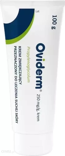 Lek o działaniu zmiękczającym na skórę. Produkt leczniczy Oviderm krem 250 mg/g jest wskazany do stosowania w leczeniu suchej skóry. Zawarty w nim glikol propylenowy wykazuje zdolność do wiązania wody oraz słabe działanie przeciwdrobnoustrojowe.