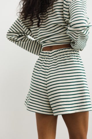 Klasyczne szorty wykonane z bawełny o charakterystycznej strukturze w zielono beżowe paseczki . Fason z luźniejszą, lekko ściętą nogawką co pozwala wysmuklić nogi. Spodenki mają nieco wyższy stan oraz gumę w pasie, co daje gwarancję wygody i umożliwia dopasowanie do wielu typów sylwetki. Nie posiadają kieszonek . Materiał naturalny , delikatny w dotyku, zapewnia wygodę […]