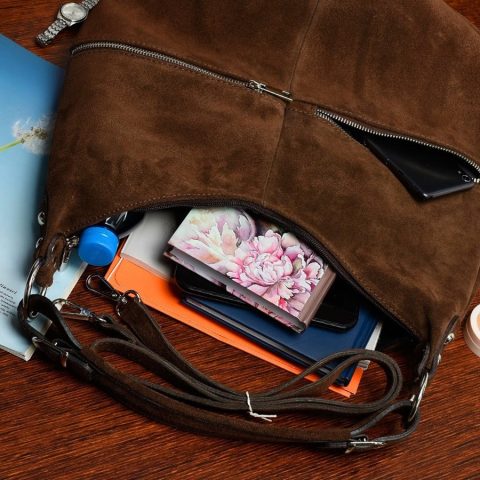 Włoska torebka skórzana w fantastycznym, brązowym, jesiennym kolorze. Wykonana jest starannie z zamszu naturalnego. W zestawie doczepiany i regulowany pasek, dzięki czemu torebkę można nosić przez ramię.