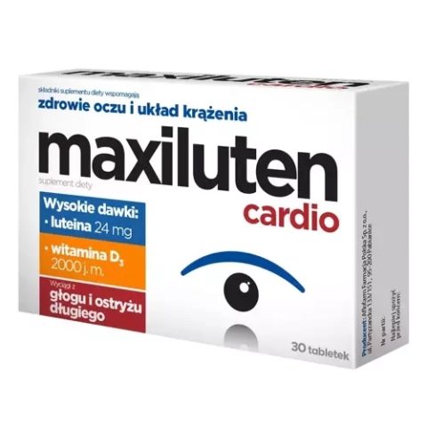 Suplement diety Maxiluten Cardio pozwala uzupełnić codzienną dietę w składniki, które wspierają zdrowie oczu i składniki, które wspierają układ krążenia. W składzie zawarto m.in. wyciągi z ostryżu długiego i głogu, wysoką porcję luteiny i witaminy D.