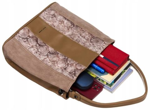 Torebka wykonana jest ze skóry ekologicznej z ozdobnymi wstawkami na przednim panelu - dwoma o wzorze przypominającym skórę węża i dwoma z eko zamszu. Jednokomorowa. Wewnątrz 3 kieszonki, na zewnątrz 1.