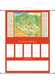 Plan lekcji z geograficzną mapą Polski dla dzieci, pełniący rolę edukacyjną, dekoracyjną na którym zaznaczono regiony i województwa wraz z ukształtowaniem terenu, jak też za pomocą kolorowych piktogramów najbardziej charakterystyczne budowle, zwierzęta, pomniki przyrody, wydarzenia....