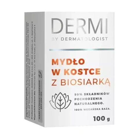 Dermi By Dermatologist Mydło w kostce z biosiarką to produkt myjący zawierają 99% składników pochodzenia naturalnego! Świetnie sprawdza się do mycia skóry tłustej i trądzikowej. Mydło skutecznie oczyszcza bez naruszania bariery hydrolipidowej.
