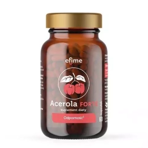 Suplement diety efime Acerola forte pozwala uzupełnić codzienną dietę w ekstrakt z owoców aceroli, czyli źródło naturalnej witaminy C. Witamina C wspiera prawidłowe funkcjonowanie układu odpornościowego i wspomaga prawidłową syntezę kolagenu.