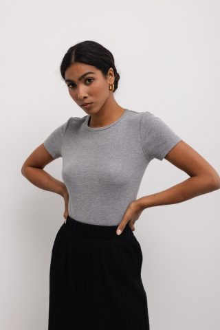 Dopasowany t-shirt basic, wykonany z cienkiej bawełny typu INTERLOCK Fason o dopasowanym kroju z krótkim rękawem oraz niewielkim, okrągłym dekoltem. Niezaprzeczalny atut modelu stanowi przyjemny w dotyku, elastyczny oraz wysokiej jakości materiał, który pozwala na doskonałe dopasowanie do sylwetki. Jeden z produktów, które stanowią idealną bazę do stworzenia niemalże każdej stylizacji. Modelka ma 174 cm […]