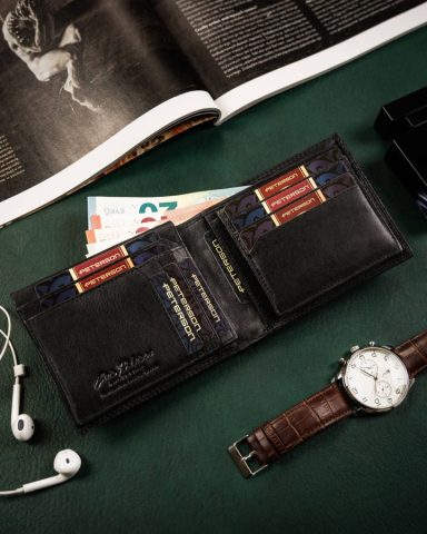 Skórzany portfel męski bez zapięcia. Wyposażony w technologię RFID Protect. Wewnątrz zakładki na karty oraz okienka na dokumenty, które zmieszczą dowód rejestracyjny. Na gotówkę przeznaczono kieszenie na banknoty oraz sekcję na bilon w formie piekiełka.