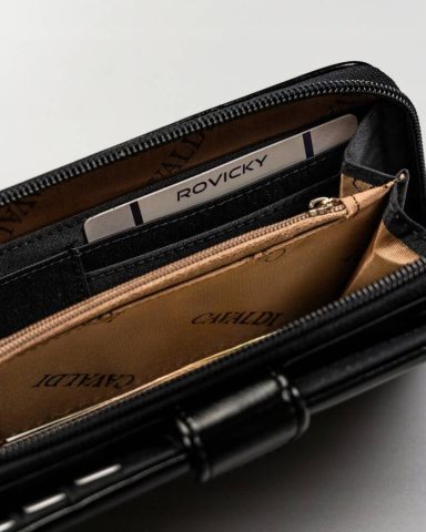 Portfel został odszyty z wysokogatunkowej skóry ekologicznej. Wnętrze na podszewce. Z tyłu portfela znajduje się praktyczna kieszonka z okienkiem. Portfel został wyposażony w dwa praktyczne zapięcia: suwak i zatrzask.