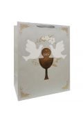 torebka prezentowa okazja: Pierwsza Komunia Święta ozdobiona motywem kielicha z Hostią z białymi gołębiami uchwyty wykonane ze srebrnej tasiemki materiał: papier gramatura: 210 g/m2 wymiary: 42x59x23cm