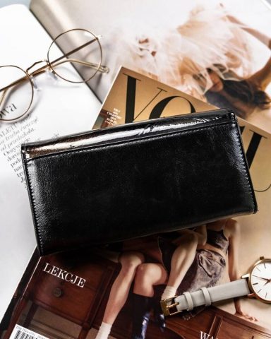 Portfel jest odszyty z najwyższej jakości skóry naturalnej i ekologicznej. Środek portfela jest wykończony skórą naturalną o ziarnistej fakturze, zaś strona zewnętrzna to lakierowana skóra eko. Model w orientacji poziomej zamykany trwałym zatrzaskiem.