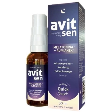 Suplement diety Avit Sen spray przeznaczony do stosowania u osób dorosłych, które zmagają się z trudnościami w zrelaksowaniu się i w zasypianiu. Preparat uzupełnia codzienną dietę w melatoninę oraz w ekstrakt z kwiatów rumianku pospolitego.