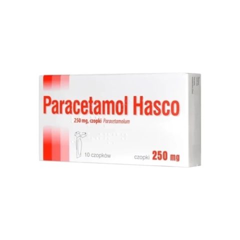 Czopki doodbytnicze Paracetamol Hasco 250mg to produkt leczniczy zawierający jako substancję czynną paracetamol, który działa przeciwgorączkowo i przeciwbólowo. Lek jest wskazany do stosowania przy różnego rodzaju bólach i w stanach gorączkowych.