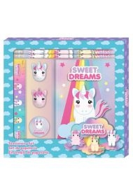 Zestaw piśmienniczy Sweet Dreams od KIDS EUROSWAN. W jego skład wchodzą: 1x zeszyt A5 z motywem Jednorożca, 1x linijka, 2x ołówek, 2x gumka, 1x temperówka.Wymiary opakowania: 15x2x27cmWiek: 3+