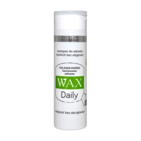 Wax Pilomax Daily szampon włosy cienkie to preparat do codziennego stosowania. Zapewnia skuteczne, a zarazem delikatne oczyszczenie, ponadto nadaje włosom objętość. W składzie zawarto kolagen morski, pokrzywę, ekstrakt z kasztanowca i pantenol.