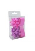 zestaw ozdób do pakowania prezentów zawiera: ,2 rozetki i 2 pasma wstążek kolor: różowy i fioletowy