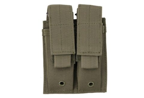 Podwójna ładownica pistoletowa Podwójna ładownica kompatybilna z systemem MOLLE/PALS, mieszcząca 2 standardowe magazynki pistoletowe. Zamykana na klapę z rzepem.
