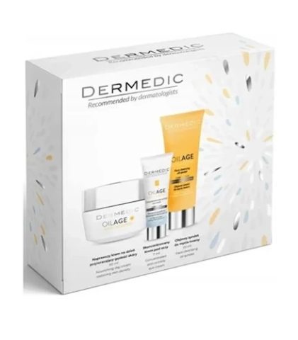 Dermedic Zestaw Oilage to 3 wyjątkowe kosmetyki dedykowane skórze wrażliwej i dojrzałej, na której widoczne są takie oznaki starzenia jak m.in. zmarszczki. Jest to Naprawczy krem na dzień, Skoncentrowany krem pod oczy, Olejowy syndet do mycia twarzy.