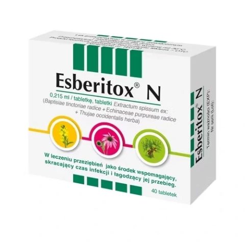 Produkt leczniczy Esberitox N jest lekiem roślinnym zawierającym jako substancje czynne wyciągi z ziela żywotnika zachodniego, korzenia jeżówki purpurowej, korzenia dzikiego indygo. Lek jest wskazany do stosowania wspomagająco w leczeniu przeziębień.