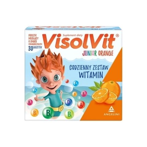 Visolvit Junior smak pomarańczowy to suplement diety, który uzupełnia codzienną dietę dzieci powyżej 3. roku życia i młodzieży w zestaw 9 witamin, m.in. w witaminę D i witaminy z grupy B. Preparat ma postać musującego granulatu o smaku pomarańczowym.