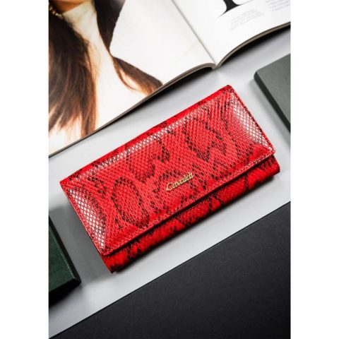 Pojemny duży portfel damski w czerwonym kolorze. Ozdobiony modnym, drapieżnym wzorem wężowej skóry. Wykonany z wytrzymałej ekoskóry oraz skóry naturalnej. Dzięki przemyślanej konstrukcji i modnemu wzornictwu portfel idealnie sprawdzi się na prezent!