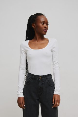 Dopasowany longsleeve wykonany z delikatnej dzianiny w kolorze białym. Fason o dopasowanym kroju z długim rękawem oraz głębszym półokrągłym dekoltem. Bardzo kobiecy detal który pozwoli wyeksponować biust. Niezaprzeczalny atut modelu stanowi przyjemny w dotyku, elastyczny oraz wysokiej jakości materiał, który pozwala na doskonałe dopasowanie do sylwetki. Jeden z produktów, które stanowią idealną bazę do stworzenia […]