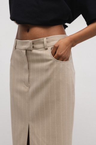 Spódnica midi wykonana z tkaniny w paski w kolorze beżowym. Zanurz się w subtelnej elegancji z naszą spódnicą MIDI RADIANCE w kolorze beżowym, oraz delikatnymi białymi paskami. Ta długa spódnica jest symbolem wyrafinowanego stylu i komfortu. Jej długość MIDI doskonale balansuje między nowoczesnym wdziękiem a swobodą ruchu, a rozcięcie z przodu dodaje subtelnego efektu i […]