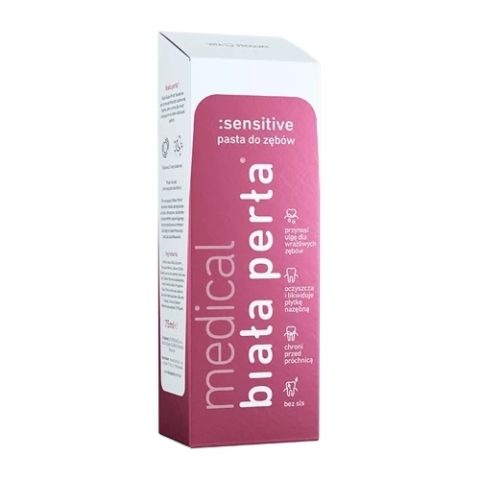 Pasta Biała Perła Sensitive to produkt szczególnie polecany dla osób, które mają wrażliwe zęby. Preparat pomaga zmniejszać nadwrażliwość zębów, jednocześnie naturalnie wybiela szkliwo. Pasta nie zawiera SLS i ma bardzo niski wskaźnik ścieralności.