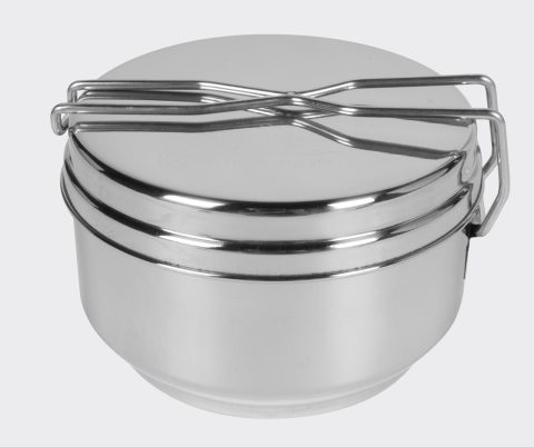 Trzyczęściowy zestaw garnków, w skład którego wchodzą: dwa wkładane w siebie naczynia o pojemnościach: 1 litr (średnica 15 cm) i 0,7 litra (średnica 13 cm), oraz pokrywka o średnicy 15 centymetrów, która sprawdza się jako patelnia. Całość wykonana z elektropolerowanej stali nierdzewnej, której grubość pozwala na gotowania bezpośrednio na ogniu, bez ryzyka odkształcenia lub przepalenia.