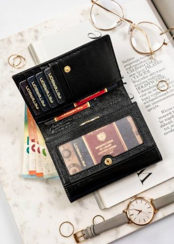 Portfel damski z wysokojakościowej skóry naturalnej. Zamykany klapą z zatrzaskiem, ozdobioną logo marki w złotym kolorze. Wewnątrz rozbudowana sekcja na gotówkę i kieszeń na suwak. Portfel w markowym pudełku. Wyposażony w system RFID.