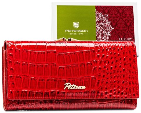 Portfel damski Peterson ze skóry naturalnej w modnym wzorze skóry krokodyla. Wyposażony w praktyczny zatrzask, portmonetkę na bigiel oraz technologię RFID, chroniącą karty przed kradzieżą danych. Elegancki i funkcjonalny wybór na co dzień!