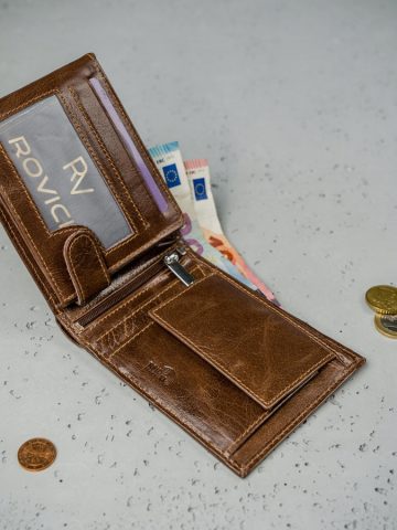 Poziomy portfel męski bez zewnętrznego zapięcia. Wykonany ze skóry naturalnej. Wewnątrz dużo zakładek na karty, kieszenie na dokumenty, zasuwany schowek oraz sekcje na gotówkę.
