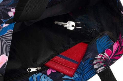 Shopperka została uszyta z wysokogatunkowego i wytrzymałego materiału poliestrowego. Posiada śliczne zdobienie. Jednokomorowa z dwiema kieszeniami. Środek na podszewce. Zawieszona na wygodnych uchwytach. Wyposażona też w odpinany, regulowany pasek.