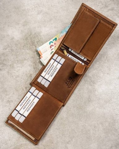 Portfel odszyty z trwałej nubukowej skóry naturalnej. Model o klasycznej stylistyce. Portfel w orientacji poziomej bez zapięcia zewnętrznego. Posiada rozbudowane wnętrze. Wyposażony w technologię RFID BLOCKING SYSTEM.