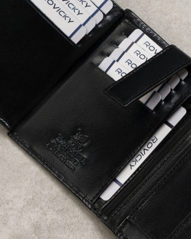 Pionowy, duży portfel w czarnym kolorze. Wykonany ze skóry naturalnej. Wewnątrz wiele zakładek na karty, kieszenie na dokumenty mieszczące dowód rejestracyjny oraz pionowy schowek na suwak. Do tego kieszenie na banknoty i przegródka na bilon.