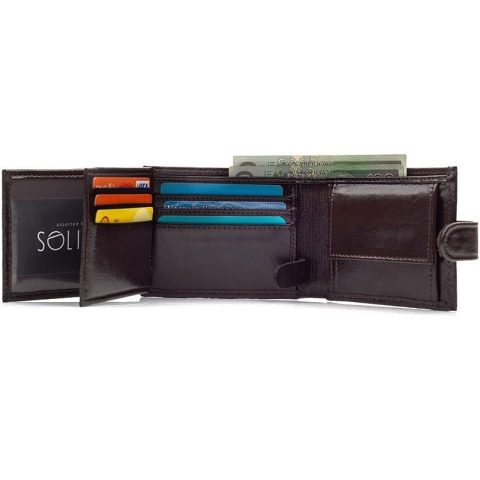 Portfel męski marki SOLIER, wykonany wysokiej jakości skóry naturalnej w kolorze ciemnym brązowym. Idealny dla mężczyzn wymagających, ceniących sobie elegancję, komfort użytkowania oraz najwyższą jakość produktów. Wymiary: 9 x 13 cm