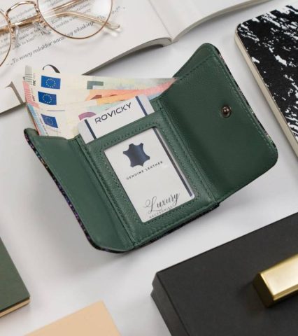 Kompaktowy portfel damski z eleganckim, kwiatowym wzorem. Wykonany ze skóry naturalnej. Wewnątrz zakładka na kartę oraz wygodna kieszeń na banknoty. Sekcja na monety zewnętrzna, zamykana biglem. Portfel z systemem RFID Protect.