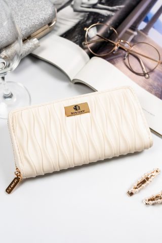 Biały, duży portfel-piórnik damski ze skóry ekologicznej o marszczonej fakturze. Wszystkie okucia w pięknym kolorze złotym. Portfel zamykany suwakiem. Zapakowany jest w eleganckie, oryginalne pudełko.