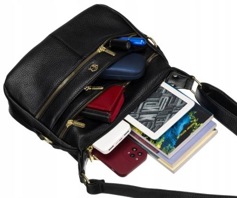 Funkcjonalna torebka o oryginalnym designie zawieszona na regulowanym pasku. Czarna, groszkowa faktura wraz ze złotymi okuciami tworzą modną kompozycję. Torebka odszyta ze specjalnie wyselekcjonowanej skóry ekologicznej. Zawieszona na regulowanym pasku.