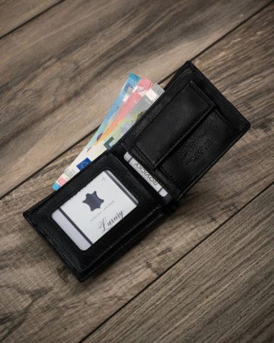 Mały portfel męski ze skóry ekologicznej. Wzmacniany od wewnątrz skórą naturalną. Bez zewnętrznego zapięcia. Wyposażony w zakładki na karty oraz sekcje na gotówkę z dwoma kieszeniami na banknoty i przegródką na bilon zamykaną napą.
