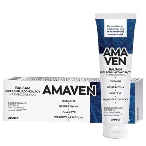 Amaven Balsam pielęgnująco-kojący na zmęczone nogi to preparat do codziennego stosowania w przypadku zmęczonych i ciężkich nóg. W składzie zawarto kompozycję takich składników jak diosmina, hesperydyna, ekstrakty z wąkroty azjatyckiej i ruszczyka.