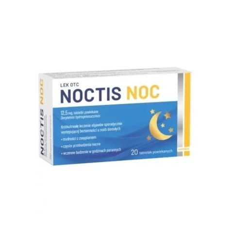 Produkt leczniczy Noctis Noc wskazany jest do krótkotrwałego stosowania w objawowym leczeniu sporadycznej bezsenności. Lek przeznaczony dla osób dorosłych. Substancją czynną leku jest doksylamina, która działa uspokajająco i ułatwia zasypianie.
