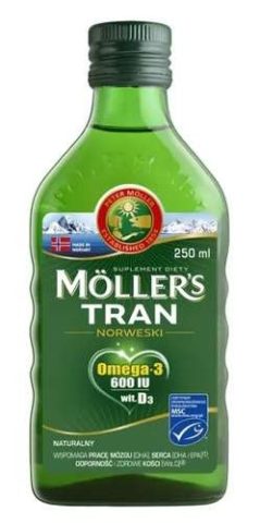 Preparat przeznaczony dla dzieci powyżej 3. roku życia oraz dla dorosłych. Suplement diety Tran Mollers naturalny zawiera wysokiej jakości olej z wątroby dorsza, który jest cennym źródłem kwasów tłuszczowych Omega-3 (DHA i EPA) i witamin – A i D.
