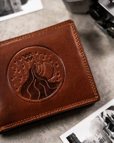 Portfel odszyty z trwałej skóry naturalnej, o klasycznej stylistyce. Model w orientacji poziomej bez zapięcia zewnętrznego. Na froncie portfela został wytłoczony znak zodiaku. Portfel mieści dowód rejestracyjny. Wyposażony w technologię RFID.