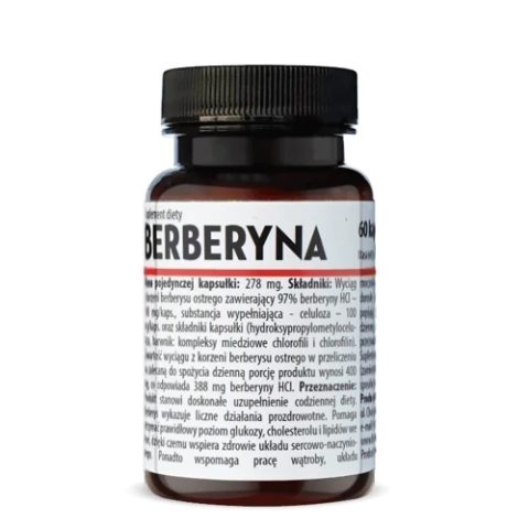 Suplement diety Berberyna to preparat, który zawiera wyciąg z korzeni berberysu ostrego standaryzowany na 97% zawartość berberyny HCl. Uzupełnianie codziennej diety w ten składnik jest polecane jako wsparcie dla układu sercowo-naczyniowego.